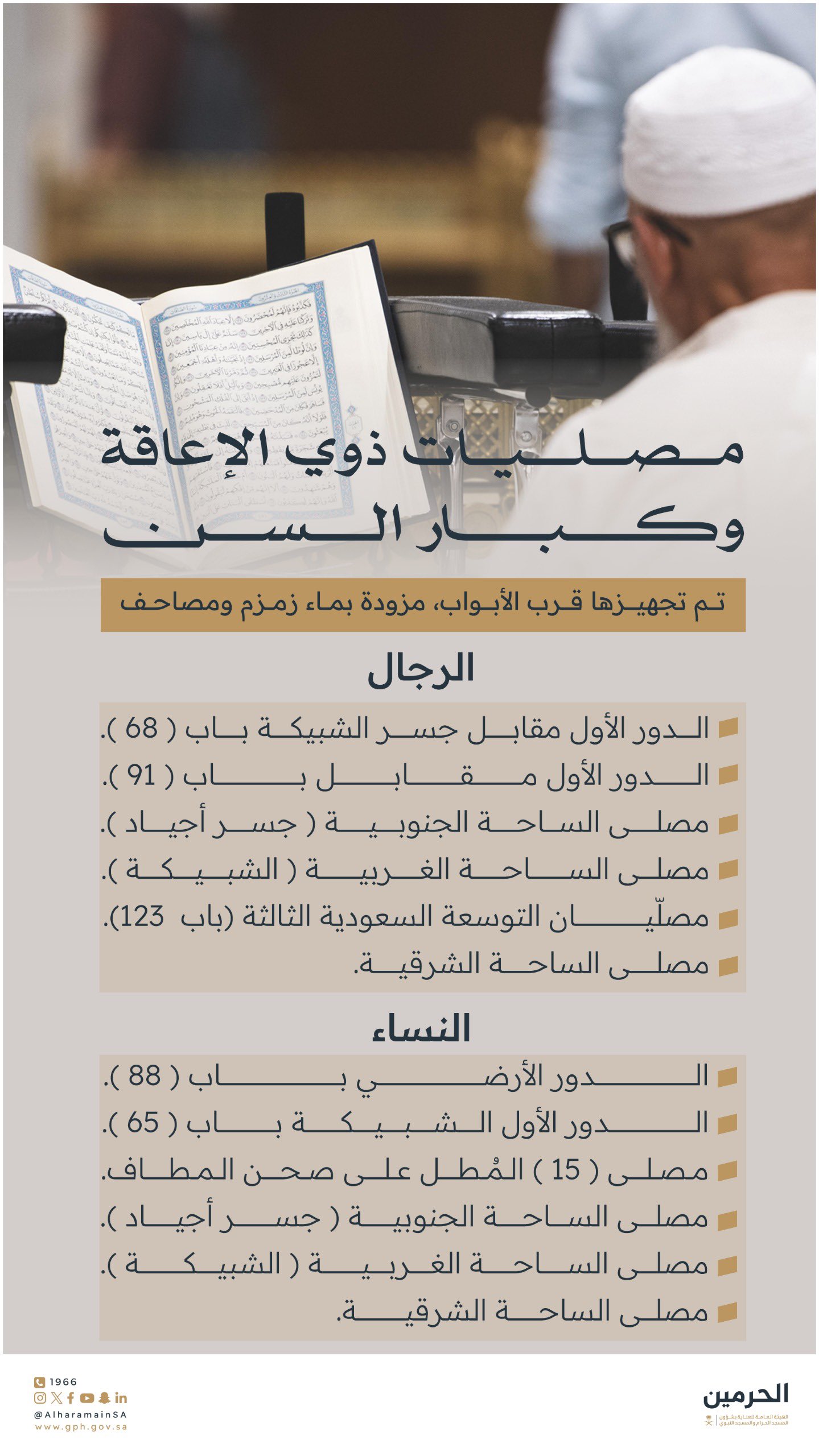 كما حددت الهيئة مواقع مهيأة للصلاة لكبار السن وذوي الإعاقة في عدد من المواقع الإستراتيجية داخل المسجد الحرام. إذ جرى تخصيص مواقع للرجال تشمل توسعة الملك فهد عند الأبواب (68) و(91) والدور الأول.