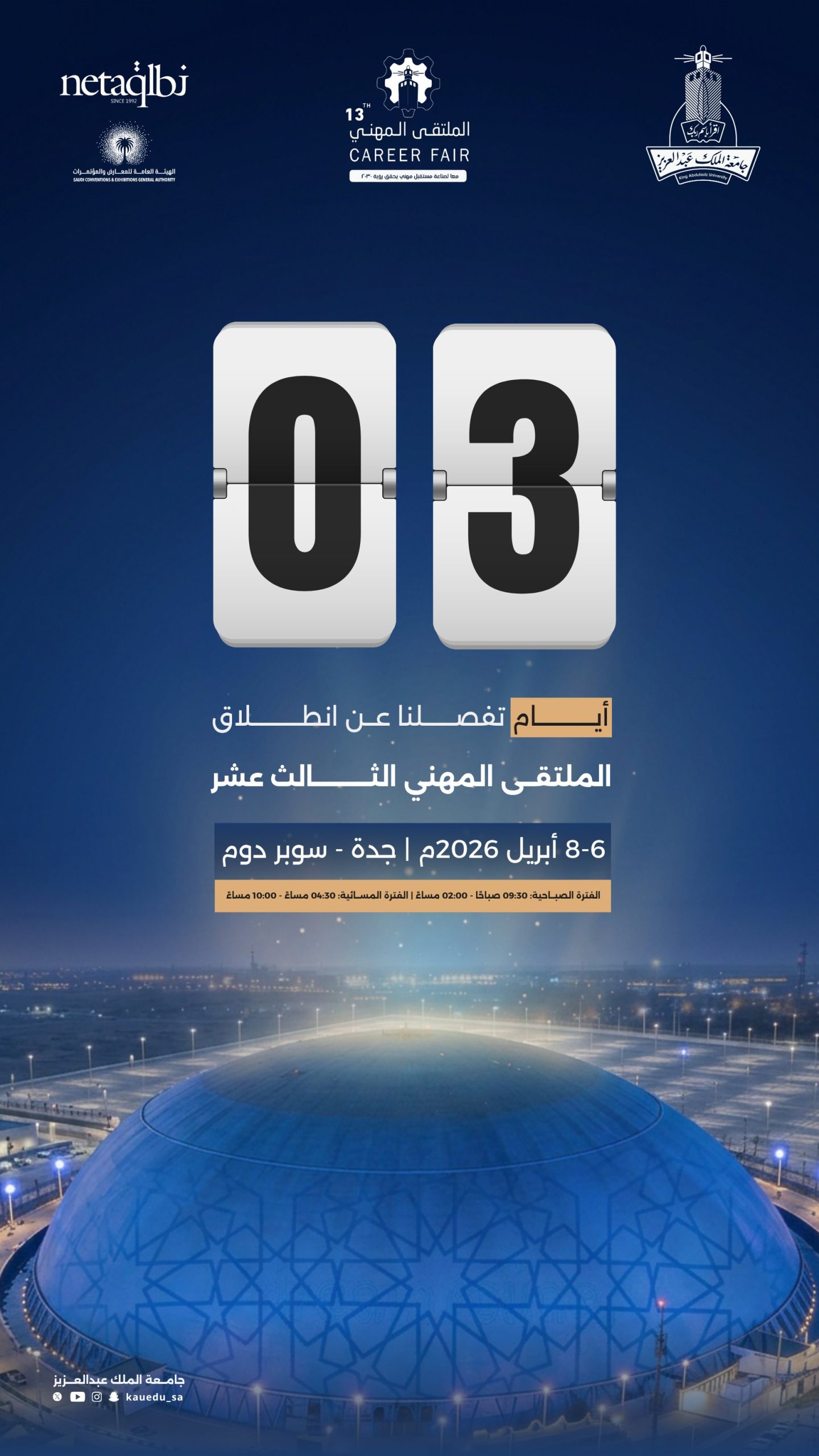 في حين يمكنك الوصول إلى كافة تفاصيل الملتقى المهني الـ13 بجامعة الملك عبدالعزيز والتسجيل من خلال الرابط الرسمي المخصص للملتقى: