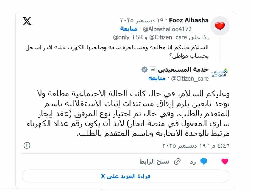 وأضاف البرنامج، عبر منصة (إكس)، أنه في حال كانت الحالة الاجتماعية مطلقة ولا يوجد تابعين يلزم إرفاق مستندات إثبات الاستقلالية باسم المتقدم بالطلب. بحسب صفحة “حساب المستفيدين” التابعة للبرنامج على منصة “إكس”.