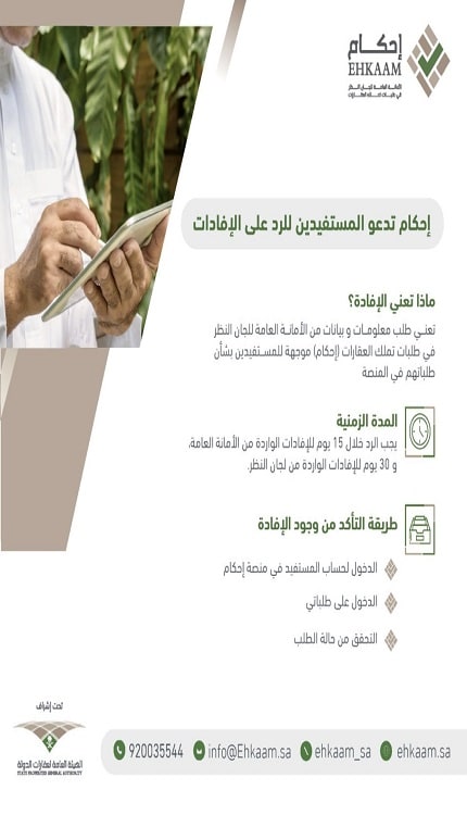 كما يعد الرد على الإفادات أمرًا مهمًا، حيث يساعد على تسريع إجراءات دراسة الطلب. كما يضمن صدور قرار عادل بشأنه. للمزيد من المعلومات، يرجى التواصل مع مركز الاتصال الموحد على الرقم 920035544. أو زيارة الموقع الإلكتروني لمنصة إحكام.