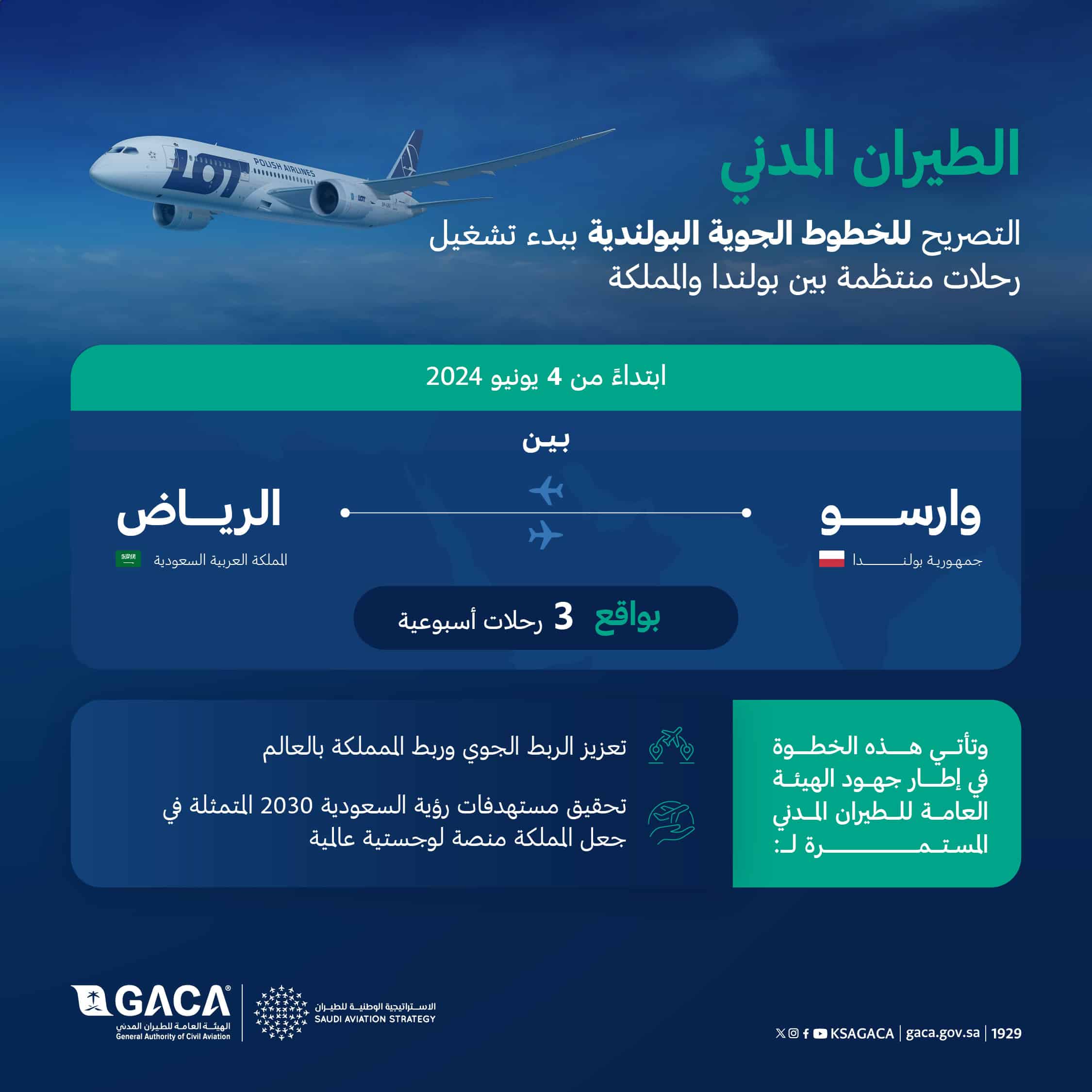 وأوضحت الهيئة عبر حسابها الرسمي على منصة إكس، أن هذه الرحلات تتجه بين وارسو والرياض، خلال موسم الصيف لعام 2024، بواقع 3 رحلات أسبوعياً، وذلك ابتداءً من 4 يونيو 2024.