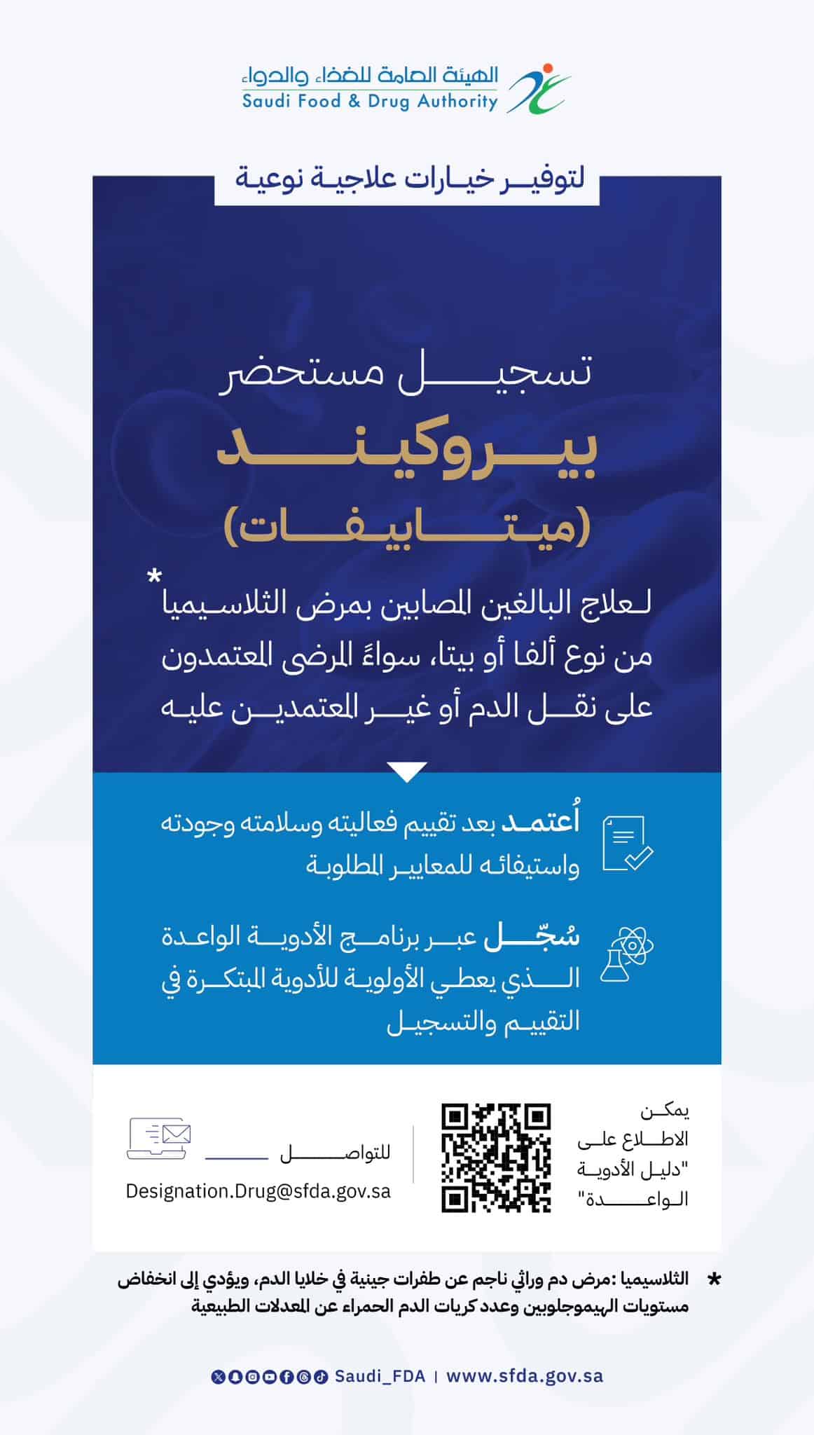اعتمدت الهيئة العامة للغذاء والدواء، تسجيل مستحضر بيروكيند (ميتابيفات) لعلاج البالغين المصابين بمرض “الثلاسيميا” من نوع ألفا أو بيتا، سواء المرضى المعتمدون على نقل الدم أو غير المعتمدين عليه.