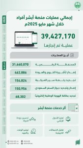 وفي السياق، نفذت المنصة التابعة لوزارة الداخلية الإلكترونية، نحو 42 مليون عملية إلكترونية للمستفيدين خلال شهر مايو 2025، عبر منصتي “أبشر أفراد” و”أبشر أعمال”.