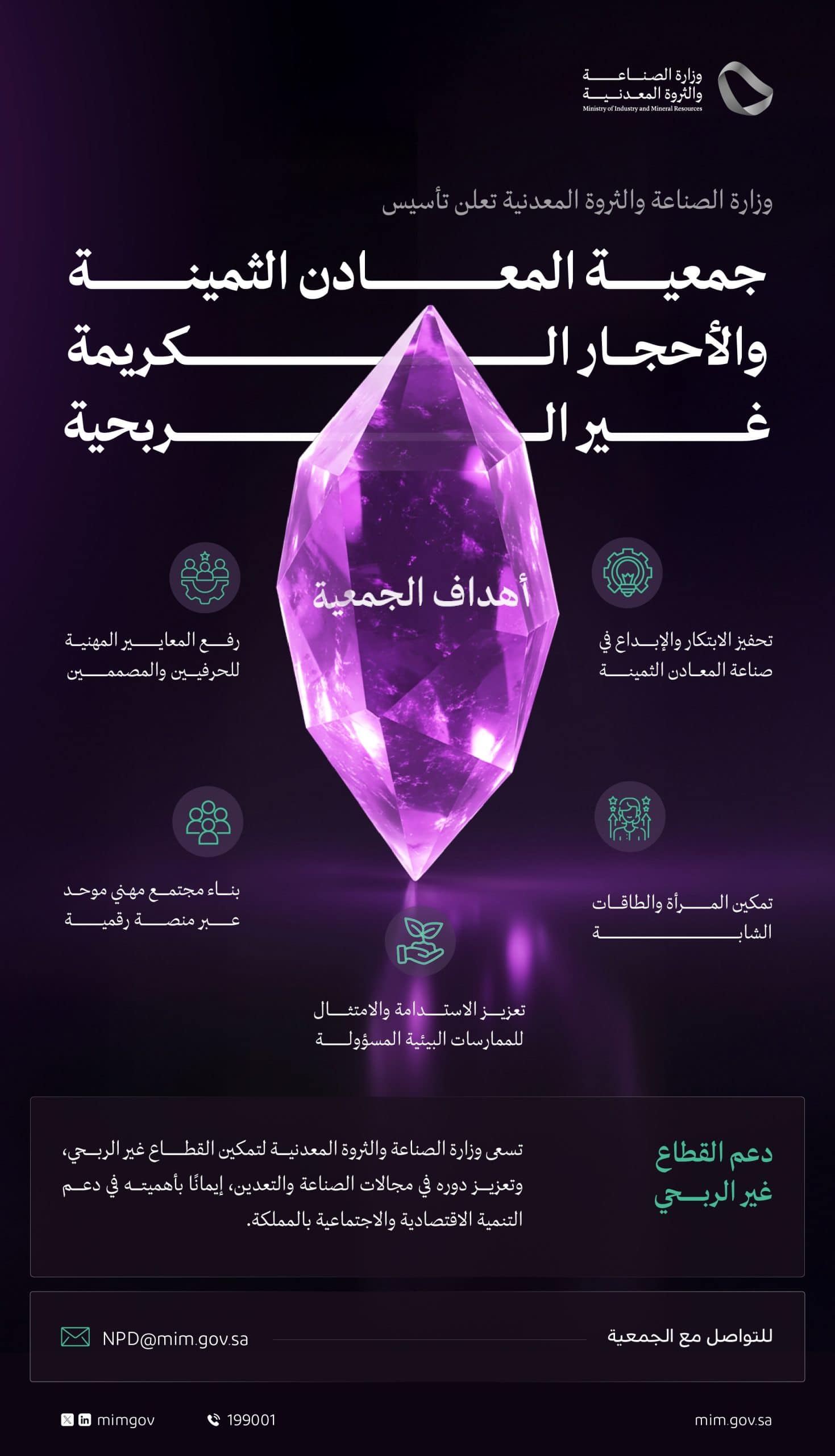 الجدير بالذكر أن تأسيس جمعية المعادن الثمينة والأحجار الكريمة غير الربحية. يأتي ضمن جهود وزارة الصناعة والثروة المعدنية لتمكين القطاع غير الربحي. وتعزيز دوره في مجالات الصناعة والتعدين. وزيادة إسهاماته وأثره المباشر في إجمالي الناتج المحلي للاقتصاد الوطني. وفقًا لمستهدفات رؤية المملكة 2030.
