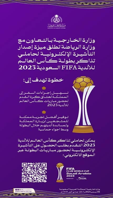 أعلنت وزارة الخارجية السعودية ووزارة الرياضة، اليوم الأربعاء 6 ديسمبر 2023، عن إطلاق ميزة إصدار تأشيرة إلكترونية لحاملي تذاكر بطولة كأس العالم للأندية FIFA السعودية 2023.