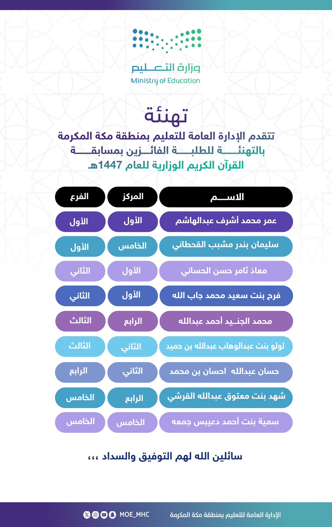 تعليم مكة يحصد المراكز الأولى في مسابقة القرآن الكريم الوزارية 1447هـ