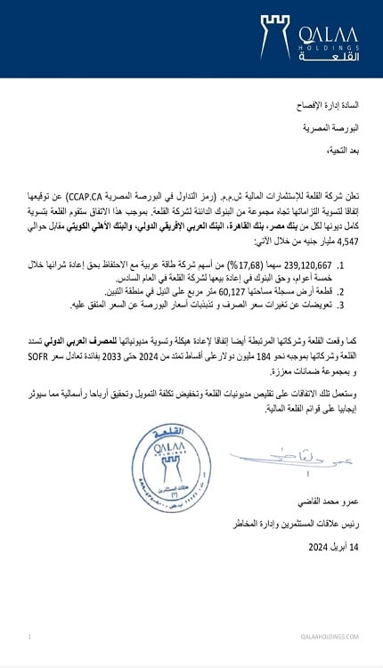 أعلنت شركة القلعة للاستثمارات المالية المصرية، اليوم الاثنين، عن توقيعها اتفاقين لتسوية التزاماتها ومديونياتها تجاه عدة بنوك بقيمة إجمالية، تتجاوز 13.5 مليار جنيه مصري.