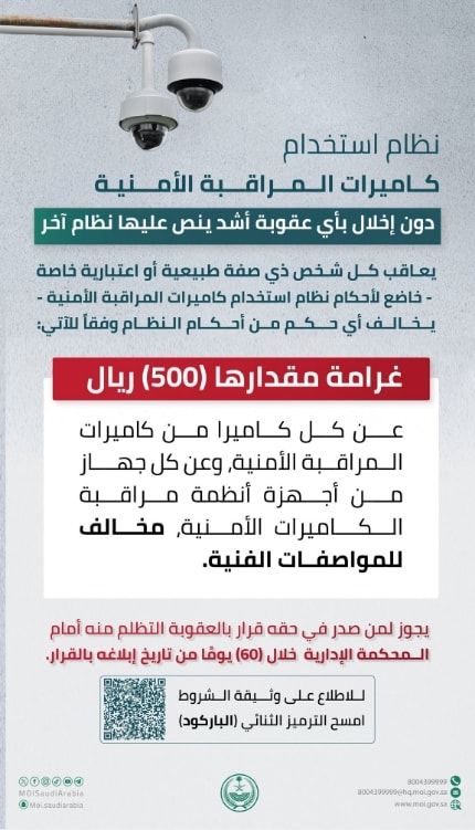 أعلنت وزارة الداخلية السعودية عن فرض غرامة مالية قدرها 500 ريال على كل كاميرا من كاميرات المراقبة، وعن كل جهاز من أجهزة أنظمة مراقبة الكاميرات الأمنية، مخالف للمواصفات الفنية المبينة في وثيقة الشروط المنشورة في موقع الوزارة.