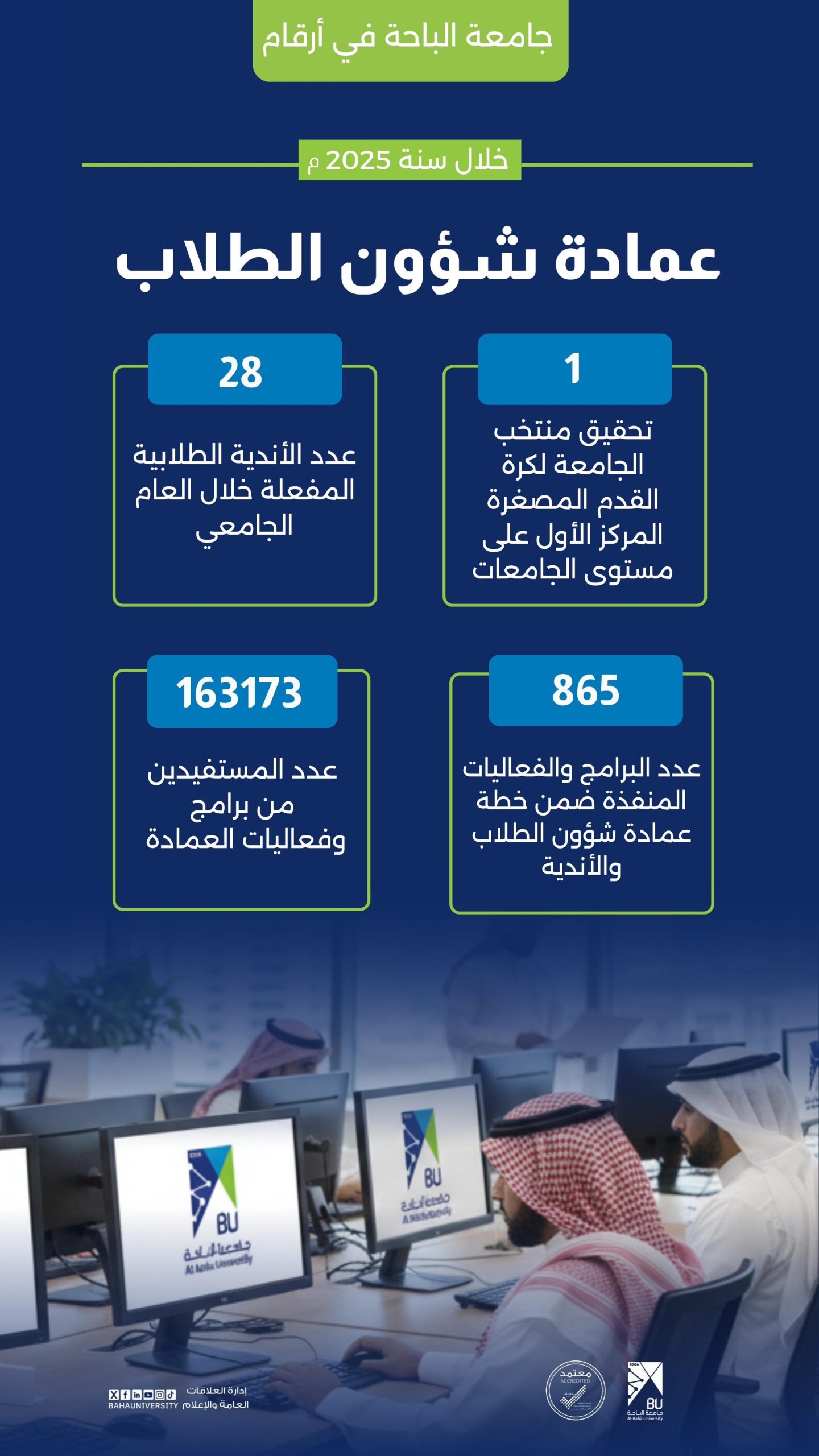 2. كذلك البرامج المنفذة: إقامة 865 برنامجًا وفعالية متنوعة ضمن خطة العمادة والأندية.