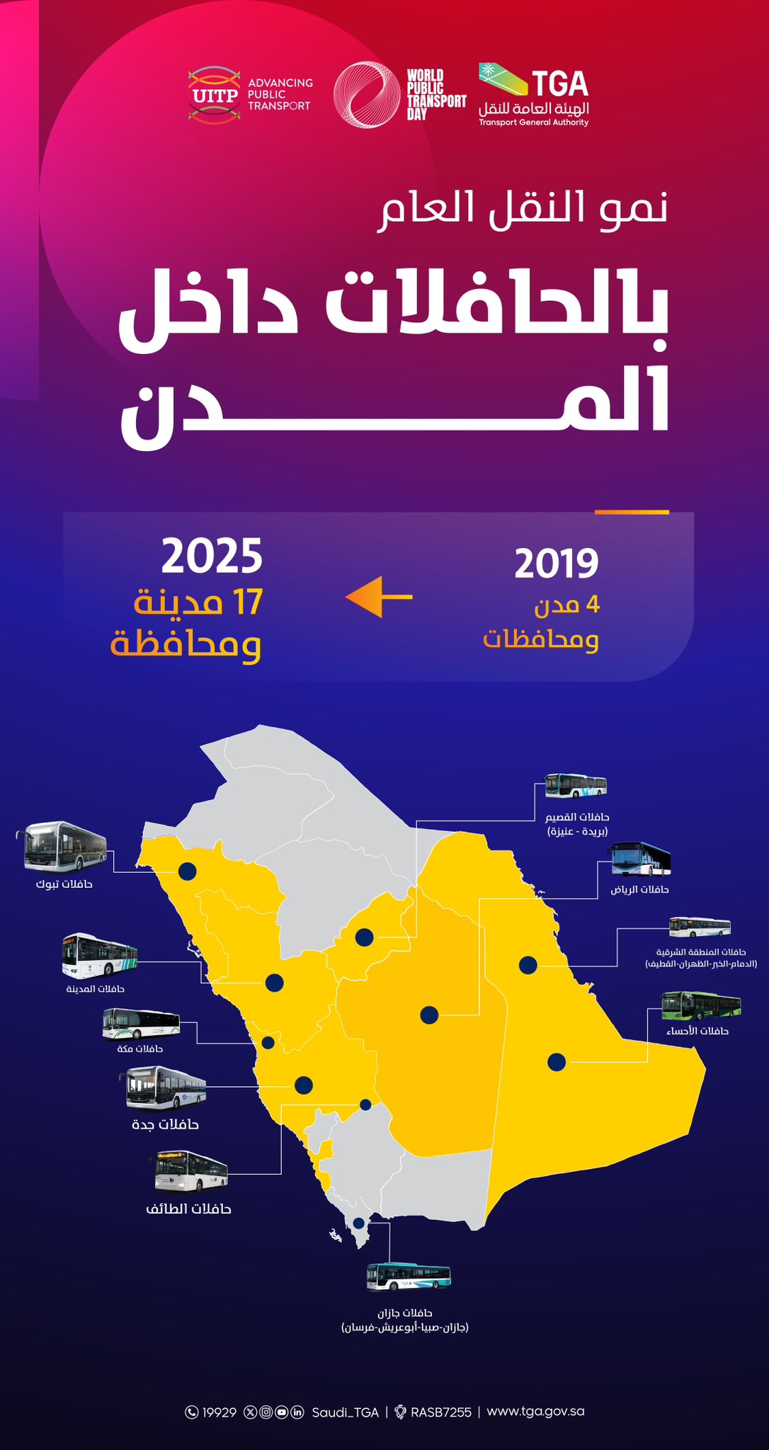 علاوة على ذلك، بينت الهيئة وفق نشرة إحصائية أن خدمات النقل بالحافلات داخل المدن شهدت توسعًا في نطاق عملها. حيث شُغِّلَت خدمات النقل العام بالحافلات في 17 مدينة ومحافظة بعدما كانت 4 مدن ومحافظات خلال عام 2019.