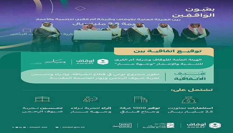 شهد الأمير سعود بن مشعل بن عبدالعزيز، نائب أمير منطقة مكة المكرمة، توقيع اتفاقية مهمة بين شركة أم القرى للتنمية والإعمار، التي تعتبر المالك والمطور لوجهة “مسار”، وبين الهيئة العامة للأوقاف، وتهدف الاتفاقية إلى تطوير مشروع استثنائي في قطاع الضيافة، وتمثل خطوة مهمة نحو تعزيز البنية التحتية السياحية في المنطقة.