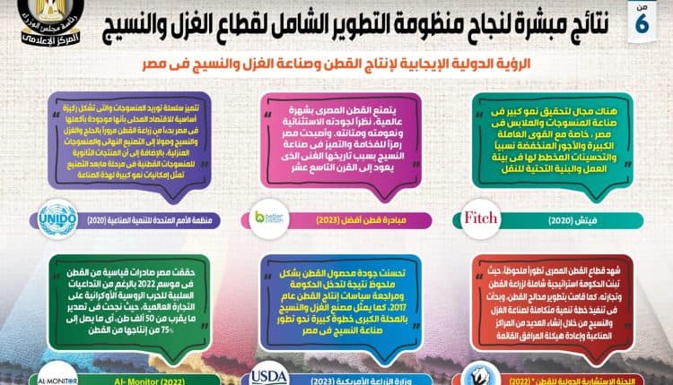 ويتميز القطن المصري بجودته الاستثنائية ونعومته ومتانته، مما جعله رمزًا للفخامة والتميز في صناعة النسيج. وقد أكدت العديد من المؤسسات الدولية على مكانة مصر الرائدة في هذا المجال، مثل فيتش ومبادرة قطن أفضل ومنظمة الأمم المتحدة للتنمية الصناعية.