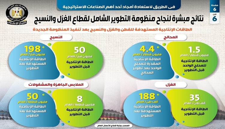كما تقوم الدولة المصرية بتطوير مشروع شركة “دمياط للغزل والنسيج”، ومشروع تطوير شركة “مصر شبين الكوم . ومشروع تطوير شركة “الدقهلية للغزل والنسيج”، ومشروع تطوير شركة “الوجه القبلى للغزل والنسيج”.