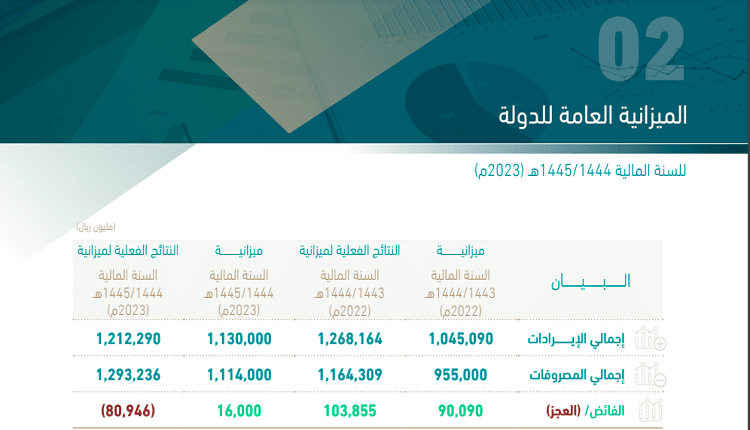 وكشفت وزارة المالية، عن أن إجمالي عجز الميزانية الفعلي خلال عام 2023 بلغ 80,946 مليار ريال. بينما أشارت إلى أن إجمالي الإيرادات النفطية الفعلية لميزانية 2023 بلغ 754,562 مليار ريال، فيما بلغ إجمالي الإيرادات غير النفطية الفعلية 457,728 مليار ريال بقفزة 11% عن الإيرادات غير النفطية في 2022، كما ارتفع الإنفاق على الصحة والتنمية الاجتماعية بنسبة 13%.