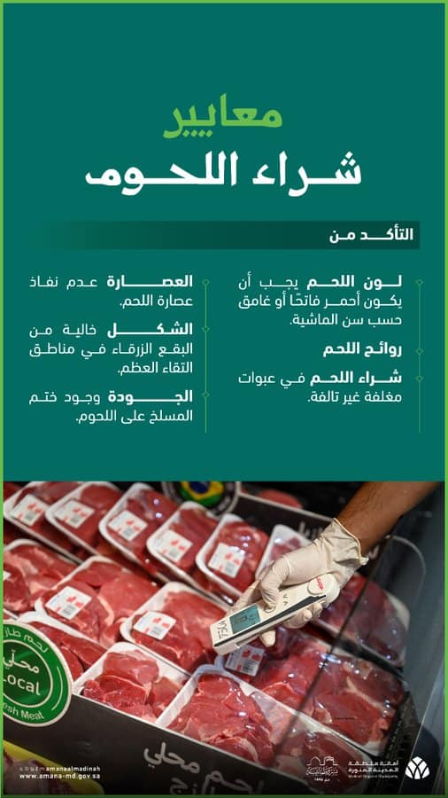 ونصت أمانة منطقة المدينة المنورة، عند شراء اللحوم بالتأكد من: