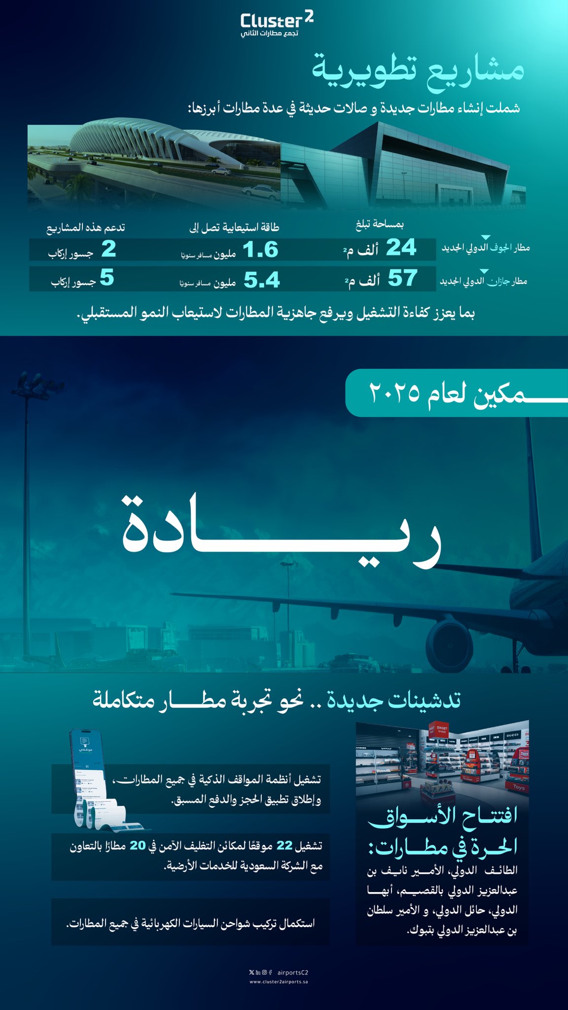 في حين شهد عام 2025 طفرة نوعية وضعت مطارات السعودية التابعة للتجمع في الصدارة، بحسب وكالة الأنباء السعودية “واس” كالتالي: