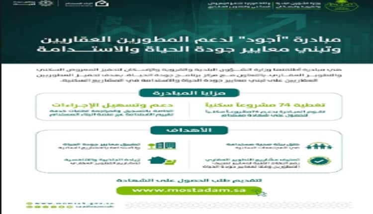 أعلنت وكالة تحفيز المعروض السكني والتطوير العقاري في وزارة الشؤون البلدية والقروية والإسكان عن انطلاق تطبيق مبادرة “أجود” على 74 مشروعًا سكنيًا، وذلك بهدف تقييم مستوى الاستدامة ومنح شهادة “مستدام”، بهدف تعزيز جودة المنتجات السكنية وتلبية تطلعات الأسر السعودية.